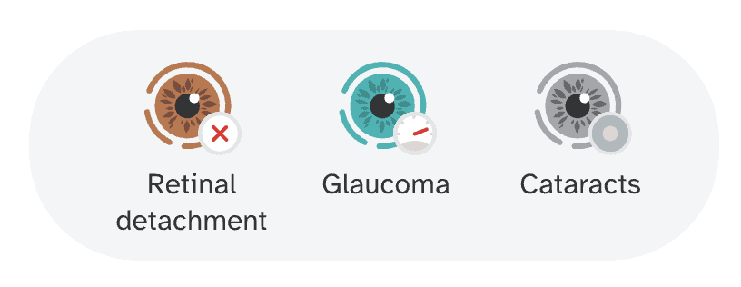 Nearsightedness can cause blurry vision, the need to squint to see clearly, and headaches from eyestrain. These symptoms can usually be managed with the use of eyeglasses, contact lenses, or corrective surgery. Nearsightedness is associated with an increased risk for other eye conditions, like retinal detachment, glaucoma, and cataracts. People with more severe nearsightedness are more at risk for these conditions.